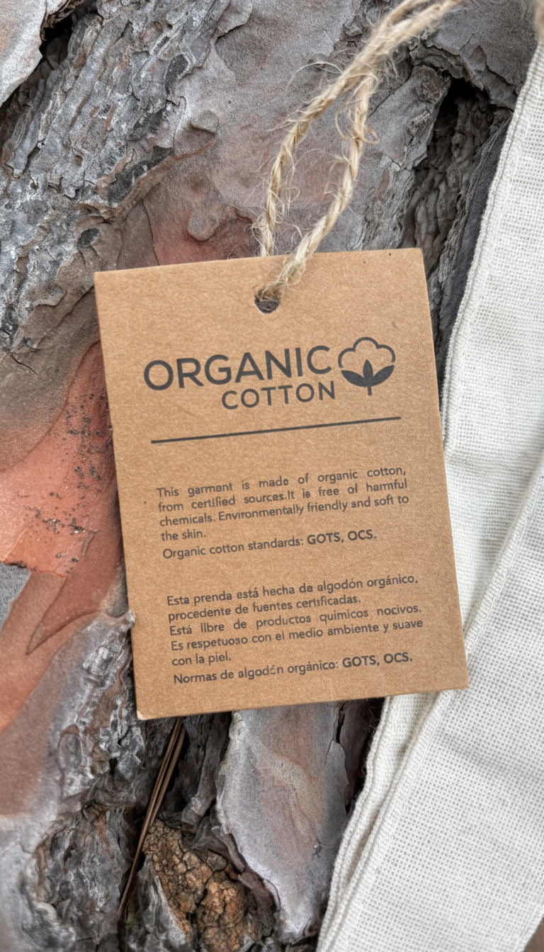 Resistencia hasta 8kg, incluida etiqueta con distintivo de algodón orgánico y hangtag en cartón reciclado.